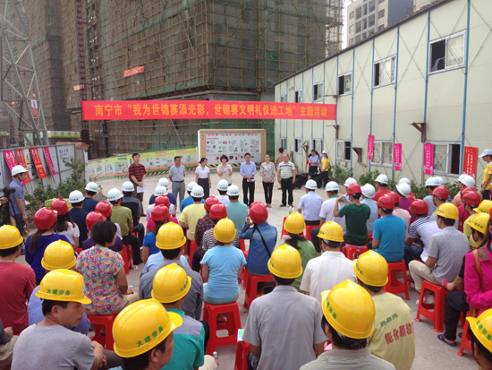 |   为切实做好“世界体操锦标赛”各项服务工作,充分展示南宁市广大青年“喜迎世锦赛、参与世锦赛、奉献世锦赛”的热情,5月16日,由共青团南宁市委主办、团邕宁区委承办的“我为世锦赛添光彩,世锦赛礼仪进工地”主题活动在邕宁区康岭花城公租房二期工地举行。