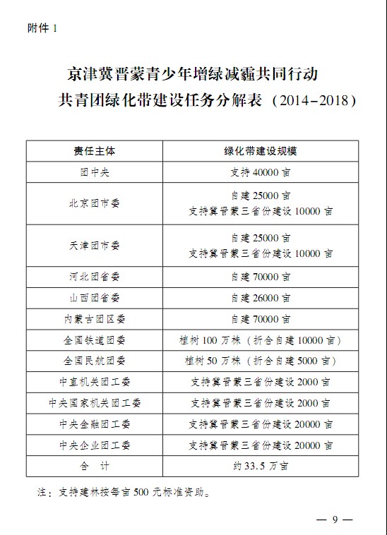 1.京津冀晋蒙青少年增绿减霾共同行动共青团绿化带建设任务分解表(2014-2018)