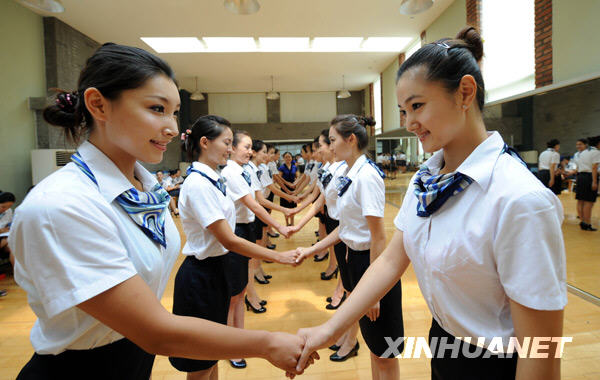 8月5日,礼仪小姐在接受严格培训。