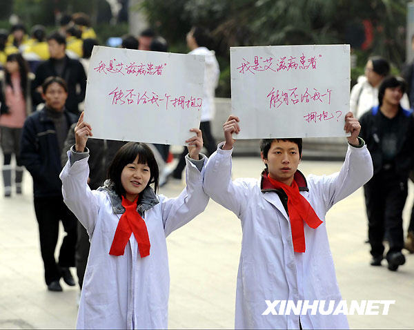 当日,为迎接12月1日世界艾滋病日,合肥工业大学的大学生志愿者走上街头,扮成“艾滋病患者”,向市民索取拥抱。学生们希望通过此举让更多的人关爱艾滋病患者,减少社会歧视,为艾滋病患者营造良好的社会环境。新华社发(马启兵 摄)