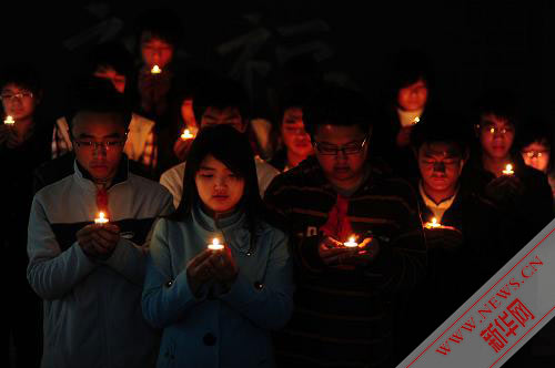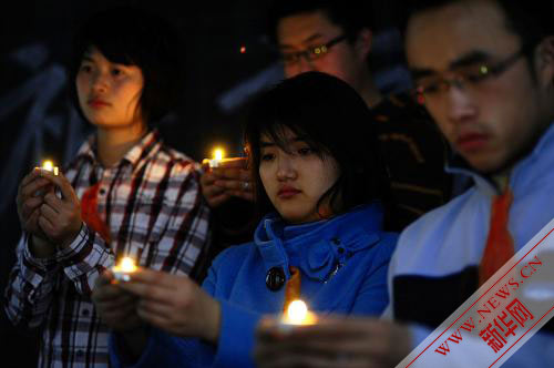 4月21日,沈阳药科大学学生一起为青海玉树地震遇难同胞祈福。