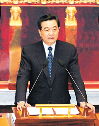 尊敬的德勃雷议长先生, 今天,有机会来到久负盛名的波旁宫,同各位议员见面,我感到十分高兴。首先,我代表中国政府和人民,向在座各位,向伟大的法兰西人民,致以良好的祝愿! 法兰西民族和中华民族都是历史文化悠久的伟大民族,虽然分处欧亚大陆两端,相距万里之遥,但两国人民的交往源远流长。500年前,法国文学巨匠拉伯雷在其传世之作《巨人传》中就曾喻示“智慧的神瓶”在中国。18世纪,法国启蒙运动思想家伏尔泰、孟德斯鸠等人在其划时代的著述中,从伦理道德、科学技术和民风民俗等方面,对中国进行了引人入胜的描述。在法国启蒙先哲的推动下,欧洲曾出现过长达半个世纪的“中国热”。19世纪以来,西学东渐,法兰西文明被大量介绍到中国。伏尔泰、孟德斯鸠、卢梭、笛卡尔、雨果、巴尔扎克、大仲马等大师的作品多次被翻译成中文,为中国人了解西方打开了重要窗口。法国大革命为近代中国人民推翻封建专制统治的斗争带来了重要启迪。20世纪初,许多满怀救国救亡之志的中国学子负笈赴法求学,寻求改造中国的道路和现代思想艺术的灵感。在这些人中,既出现了周恩来、邓小平、陈毅等中国革命的杰出领袖,也出现了巴金、钱钟书、徐悲鸿、冼星海等中国文学艺术的著名大师。两国文化漫长的交流和借鉴,为中法两国人民的友谊和两国关系的发展打下了重要基础。 40年前,毛泽东主席和戴高乐将军高瞻远瞩,决定在中法这两个东西方大国之间建立大使级外交关系,从而揭开了中法关系崭新的一页。40年来,在两国几代领导人和各界人士的共同努力下,中法关系经历了时间和国际风云变幻的考验。尤其是近年来,两国在各领域的交流和合作取得了令人瞩目的成果,两国关系日臻成熟和牢固。 在中法建交40周年之际,我来到法兰西共和国访问,就是要向世人表明,巩固和发展中法关系是中国的既定方针,我们将为此而不懈努力。 法兰西民族为人类文明进步作出了巨大贡献。法兰西文化是人类文化的瑰宝,具有很强的包容性和创新能力。在当今世界上,法国以其发达的经济、先进的科技、独特的文化和独立的外交发挥着重要作用。中国高度重视中法关系,将一如既往地从战略高度和长远角度审视两国关系,愿同法方一道努力,把两国关系不断推进到更高水平。这次来访,我同希拉克总统进行了广泛而深入的交谈。我们一致认为,在当前国际形势发生深刻变化的条件下,推动中法全面战略伙伴关系的深入发展,不仅符合两国人民的根本利益,也有利于世界的和平、稳定与繁荣。为此,双方应着重在以下三个方面作出努力。 第一,加强政治互信,深化战略合作。中法两国作为联合国安理会常任理事国,都是对国际事务具有重要影响的国家。我们两国都赞成促进世界多极化,主张维护联合国的权威,愿意推动建立符合各国人民意愿的国际政治经济新秩序。在应对人类面临的各种挑战和妥善处理重大国际事务等方面,我们两国有着广泛共识和共同利益。我们愿同法国在反对恐怖主义、防扩散、打击跨国犯罪、促进共同发展和加强联合国作用等重大问题上加强对话和磋商,进行密切合作,致力于维护世界和平、促进共同发展。 第二,加强经贸合作,实现互利互补。中国是世界上最大的发展中国家,正在全力进行现代化建设,具有广阔的市场。法国是发达国家,经济科技水平处于世界前列,在很多领域拥有领先技术。我们两国经济互补性很强,经贸合作潜力巨大。40年前,两国贸易额仅为1亿美元。去年,两国贸易额超过了130亿美元。法国在华投资共2302项,实际投入金额61.4亿美元,位居欧洲国家前列。但是,坦率地说,相对于两国在国际贸易中的地位和两国经济的互补性,中法经贸合作的潜力还没有充分发挥出来。中国已形成每年4100多亿美元的进口大市场。中国的进一步发展将为包括法国在内的世界各国提供更多的商机。我们愿同法国深化在高技术、农业、环保和中小企业等领域的全面合作,不断开拓合作的新领域,推动经贸关系不断迈上新台阶,使两国成为稳定的经贸合作伙伴。 第三,加强文化交流,丰富交往内涵。文化交流是各民族深入交往的重要渠道,也是各民族和谐相处的重要基础。不同文化的相互借鉴和融合,对增进各国人民的相互了解十分重要。中法都有着民族特点鲜明的灿烂文化,也互为对方的文化所吸引。深入发展文化交流,不仅有利于促进我们两国文化的繁荣发展,也有利于促进世界不同文明之间的对话与沟通,有利于人类社会的和谐与进步。正在法国举行的中国文化年活动,向法国人民生动地展示了中国古老文化的迷人魅力和中国当代文化的蓬勃活力。今年10月,法国文化年活动将在中国举行。我相信,这项活动将受到中国人民的喜爱。我们愿意进一步加强两国文化交流,促进中华文明和法兰西文明这两个伟大文明的相互借鉴,让这两朵人类文明奇葩在绚丽多姿的世界文化百花园中进一步绽放出夺目的异彩。 女士们、先生们! 中华民族有着悠久的历史,在5000多年的历史演进中创造了灿烂的文明,为人类社会发展作出了不可磨灭的贡献。16世纪以前,中国经济科技发展处于世界前列。16世纪以后,在世界科技文化快速发展的潮流中,中国逐渐落伍了。19世纪中叶以后,由于封建统治的腐败和列强的侵略,中国逐渐成为半殖民地半封建国家。中国人民为改
